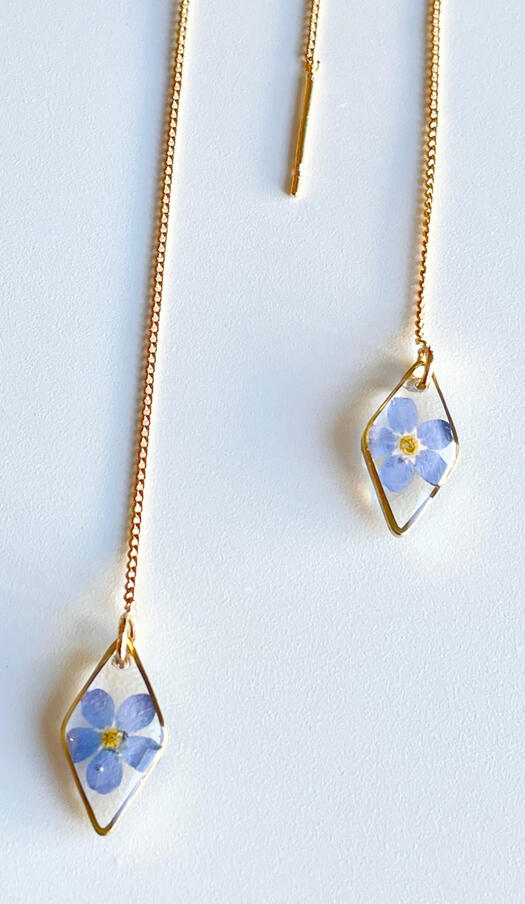 Each earring features real preserved forget-me-not flowers.