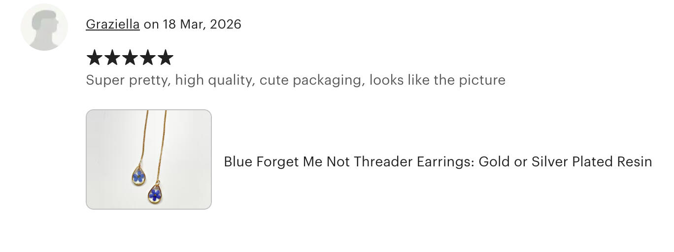 Each piece in my shop begins with real flowers — carefully selected, pressed, and preserved in resin to create lasting botanical keepsakes.Inspired by wildflowers, quiet moments, and the charm of cottagecore living, my designs are made to feel personal and timeless.From delicate jewellery to nature-inspired décor, everything is handcrafted in small batches with attention to detail.Whether you're looking for a meaningful gift or something special for yourself, these pieces are designed to hold beauty, memory, and a connection to nature.